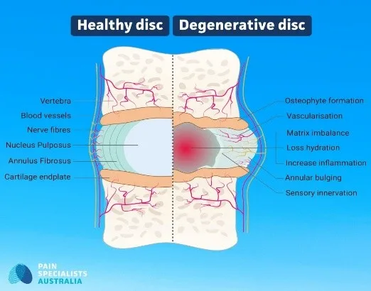Despite the term “disease”, DDD describes the progressive wear and tear of intervertebral discs: loss of water content, loss of disc height, and changes in disc structure.
