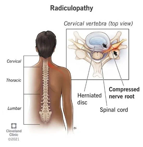 Radiculopathy refers to a condition where one or more nerve roots (as they exit the spine) become compressed or irritated, causing symptoms along that nerve’s path (pain, numbness, tingling, weakness).