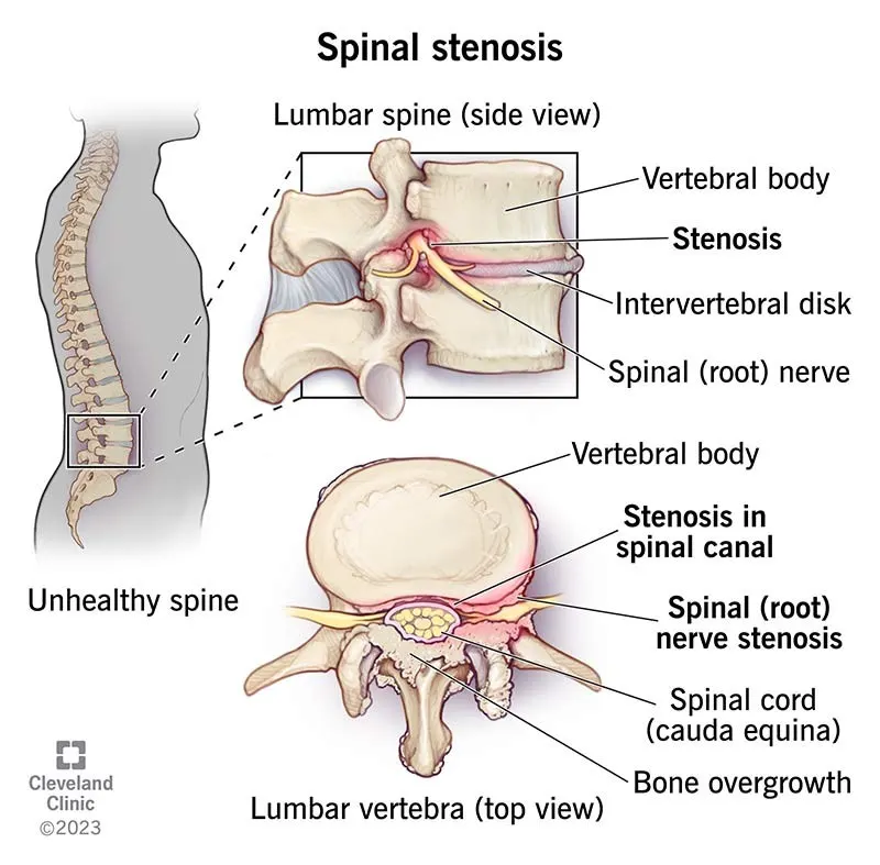 Spinal stenosis is the narrowing of one or more of the spinal canal spaces — this can include the central spinal canal, the lateral recesses, or the foramina through which nerve roots exit. This narrowing causes compression or irritation of the spinal cord or nerve roots.